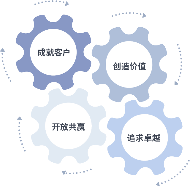 成就客户是一切决策的出发点,,,创造价值是衡量所有工作的标准,,,追求卓越是我们做事做人的态度,,开放共赢是我们的格局也是最终的结果。。价值观的齿轮环环相扣,,,推动着组织里的每个人不断向前。。